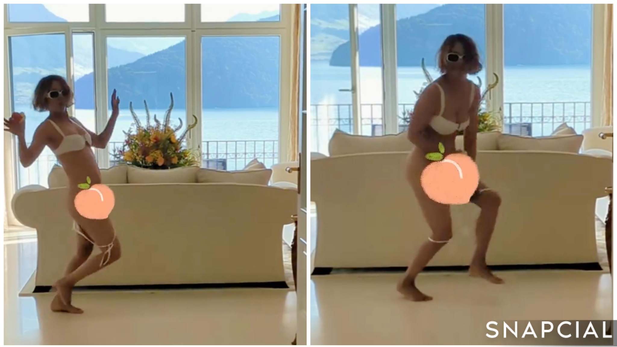 At the end of the upload, she strutted into the frame — only for her string bikini bottoms to become untied.