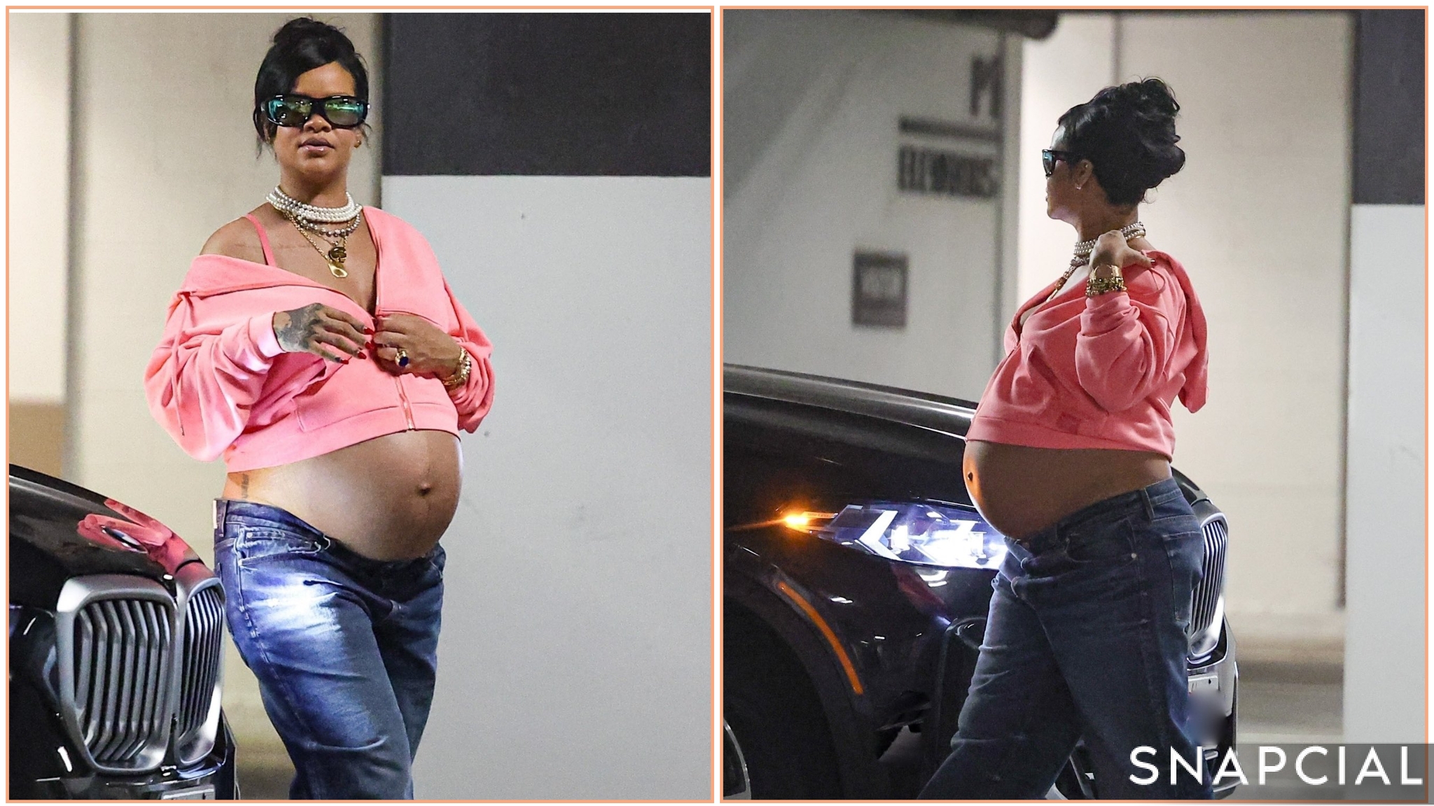 The 36-year-old singer, beauty mogul, and style icon was seen stepping out of a luxury SUV in a cropped bubblegum-pink hoodie that showed off her growing belly, paired with loose-fitting denim jeans and classic Timberland boots. Layered pearl necklaces and oversized sunglasses added a dose of glamour to the relaxed outfit, a signature Rihanna move that turns even a parking lot into a runway.