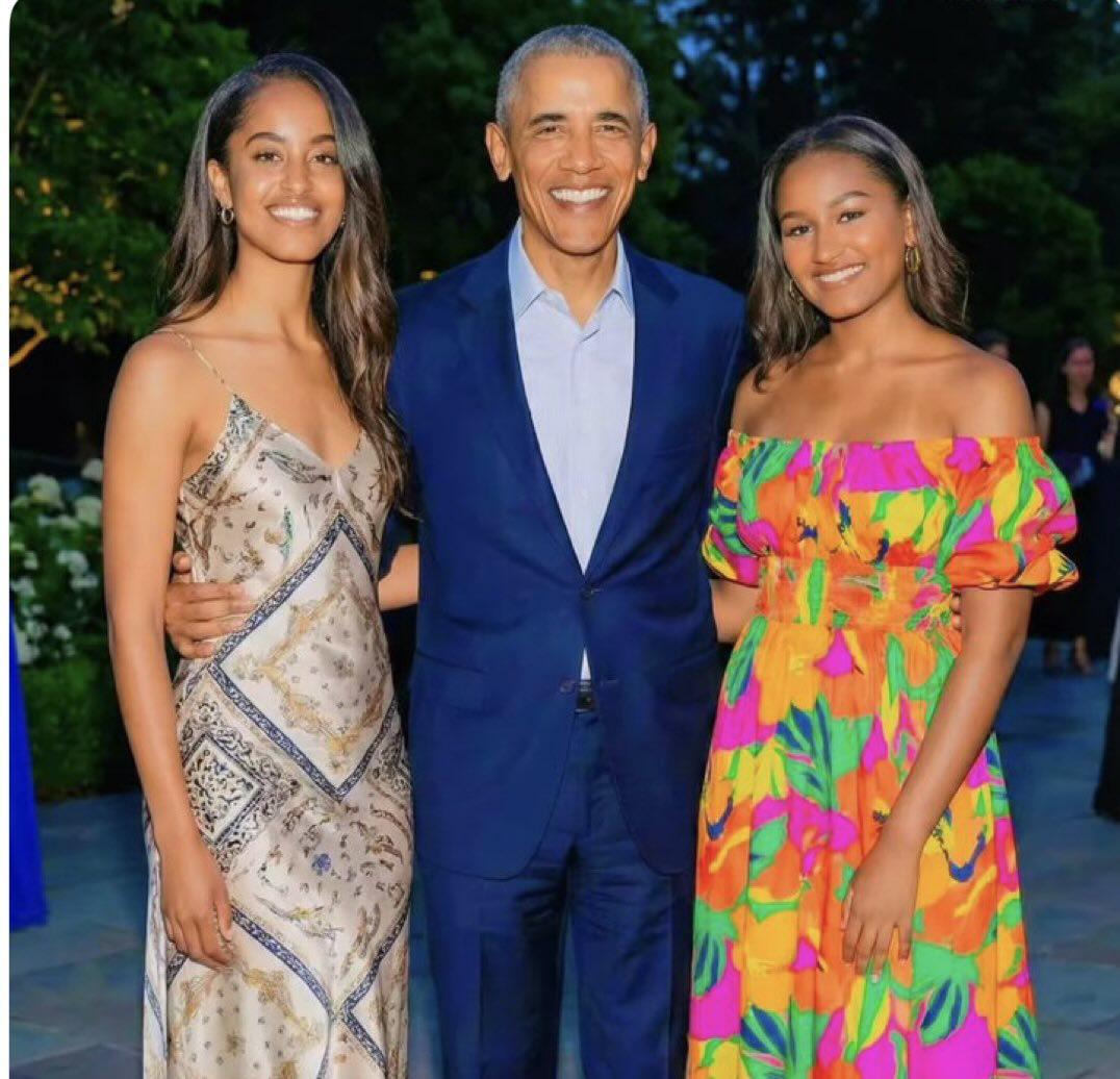 In the image, the trio looks effortlessly radiant at what appears to be an evening outdoor gathering. Obama stands centered in a classic navy suit, smiling with the same warmth that endeared him to millions. On each side are his daughters, each showcasing a unique sense of style: one in a chic patterned dress, the other in a vibrant, colorful off-shoulder gown that lights up the frame. Their confidence, poise, and presence perfectly complement the photo’s serene setting.