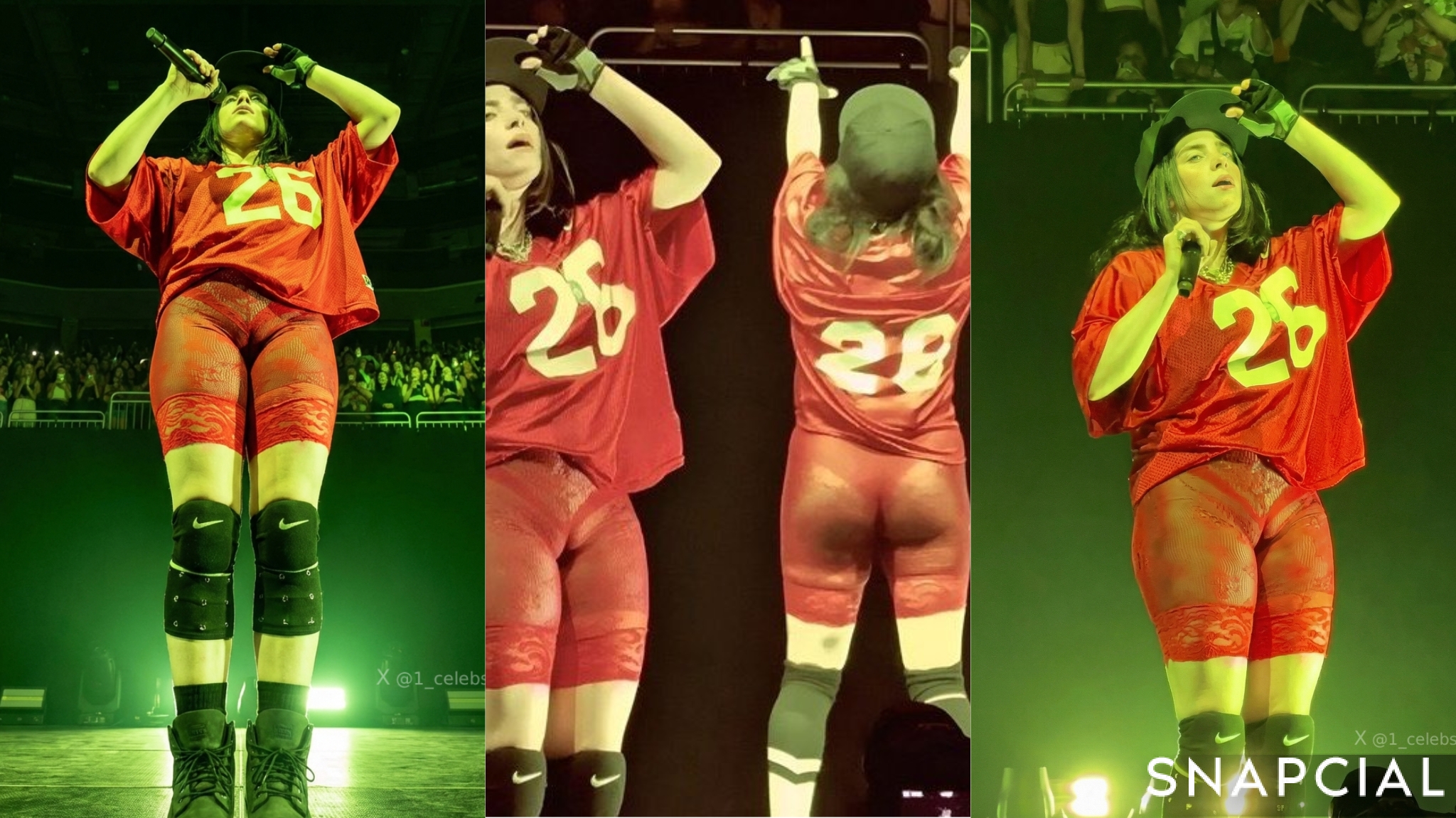 Stepping onto the stage in her signature oversized red jersey, Billie shocked the crowd when the lighting revealed see-through red net panties layered underneath. As she moved confidently across the stage, the daring detail became impossible to miss, sending fans into a frenzy both inside the arena and online.