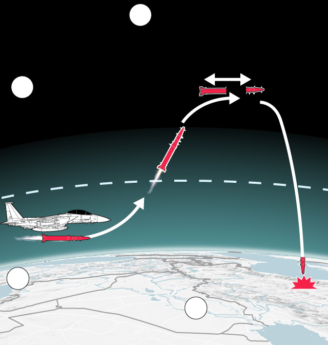 After being launched from fighter jets, booster rockets take the missile into space. The re-entry vehicle separates from the booster and locks onto a target.